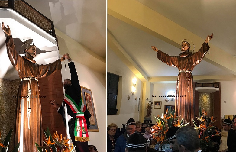 Si sono chiuse ieri sera, con una variazione sul programma, le celebrazioni in onore di San Francesco d’Assisi, nell’omonima chiesa di Epipoli. La pioggia che ha imperversato per tutto il pomeriggio sulla città ha, infatti, impedito l’uscita del Venerato Simulacro ed è stata, di conseguenza, annullata la prevista processione per le vie principali del quartiere. Dopo la Celebrazione Eucaristica delle ore 18, presieduta da padre Eugenio Staffile, il Patrono d’Italia è stato, comunque, portato sul sagrato della Chiesa, salutato dai fedeli e dalla banda musicale “Città di Siracusa”, che ha scandito le note dell’Inno nazionale e dell’Aquila di Wagner, inno della città di Siracusa. La Santa Messa ha visto la presenza del sindaco Francesco Italia che, al termine, ha riposto una chiave nelle mani di San Francesco. Un gesto che ha voluto simboleggiare la devozione al Patrono d’Italia e, al tempo stesso, la richiesta di intercessione e protezione della città e dei siracusani. I festeggiamenti in onore di San Francesco, nella parrocchia di Epipoli hanno avuto inizio il 24 settembre. Questa mattina alle 11, ha avuto luogo la tradizionale benedizione degli animali.
