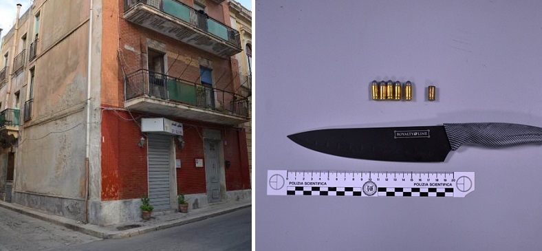 (foto: il luogo della sparatoria. A destra il coltello ed i proiettili sequestrati)