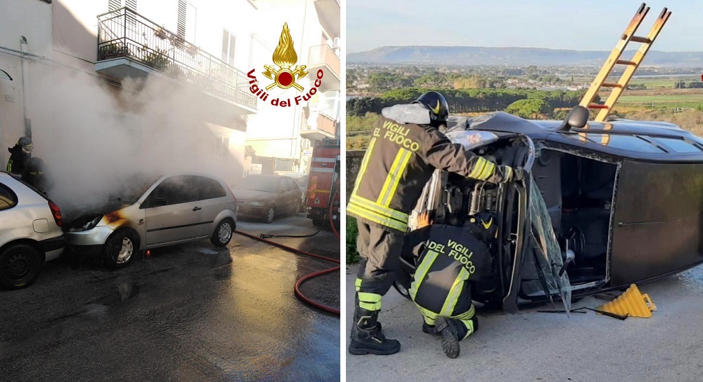 (foto: l’auto che ha preso fuoco in via Filisto e l’auto che si è ribaltata al Plemmirio)
