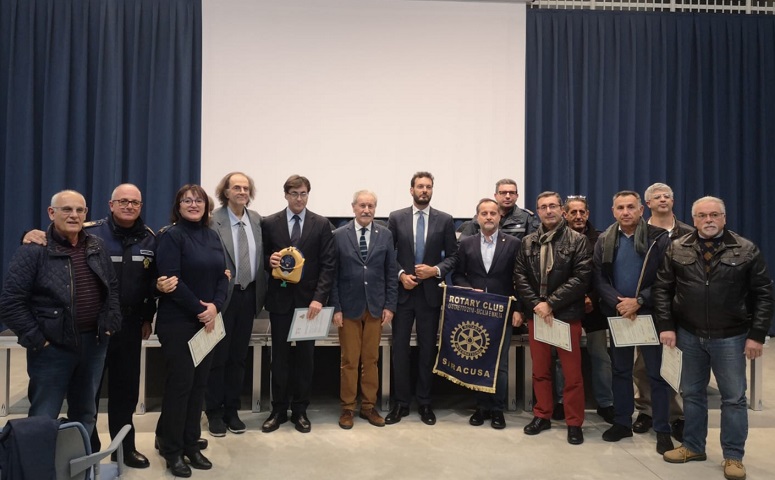 Seguendo l’esempio di altre città italiane, anche a Siracusa un’auto dei Vigili Urbani sarà dotata di defibrillatore, grazie alla collaborazione tra Comune e Rotary Club. In tal senso, 18 agenti hanno seguito un corso, tenuto dal dottor Angelo Giudice, responsabile per il Rotary del progetto Blsd (Basic life support and defibrillation), e dai dottori Goffredo Vaccaro, presidente distrettuale del Blsd, e Maurilio Carpinteri, responsabile del reparto di Anestesia e rianimazione dell’ospedale di Siracusa. Ieri sera, alla presenza del sindaco Francesco Italia, del comandante della Polizia Municipale, Enzo Miccoli, del presidente del Rotary, Francesco Tabacco, e del dottor Angelo Giudice, è avvenuta la consegna degli attestati ai 18 agenti addestrati a compiere manovre di primo soccorso e salvavita. La collaborazione tra Comune e Rotary sul fronte delle emergenze cardiologiche risale al 2016, quando i 3 club service della città donarono altrettanti defibrillatori che vennero collocati in piazza Duomo, all’inizio della pista ciclabile e in largo XXV Luglio. Quest’ultimo, più volte danneggiato e sostituito, sarà adesso montato su un’auto della Polizia Municipale.