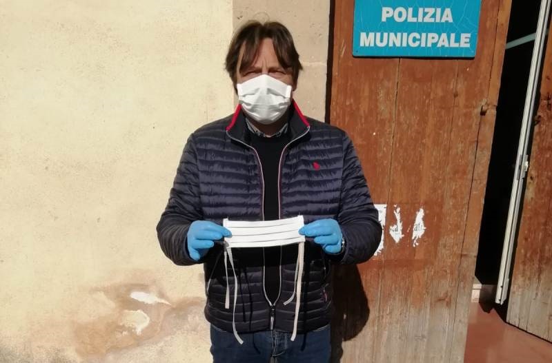 (foto: l’assessore G. Depetro mostra una delle mascherine realizzate da Carmela e Clara)