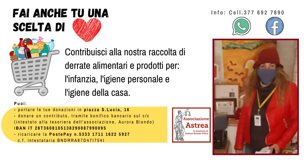 La sede dell’associazione Astrea in memoria di Stefano Biondo è in piazza Santa Lucia al civico 16 ed è sempre pronta ad accogliere ogni genere di donazione che, poi, provvederà a consegnare alle famiglie che assiste.