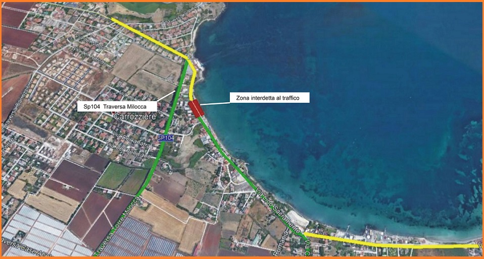 Sarà garantito il transito locale in via Lido Sacramento, nel tratto interposto tra strada Capo Murro di Porco (S.P. 58) e il civico 94 e nel tratto interposto tra strada Torre Milocca (S.P. 104) e il civico 90.