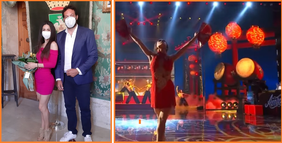 (foto: Serena Marchese con il sindaco, F. Italia. A destra un’immagine della performance ad “Amici”)