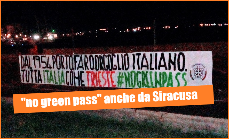 “Dal 1954 porto, faro, orgoglio italiano. Tutta Italia come Trieste. #nogreenpass”. Questo il messaggio che, dalle prime luci dell’alba, campeggia al porto grande di Siracusa come nei più importanti porti italiani, su iniziativa di CasaPound.