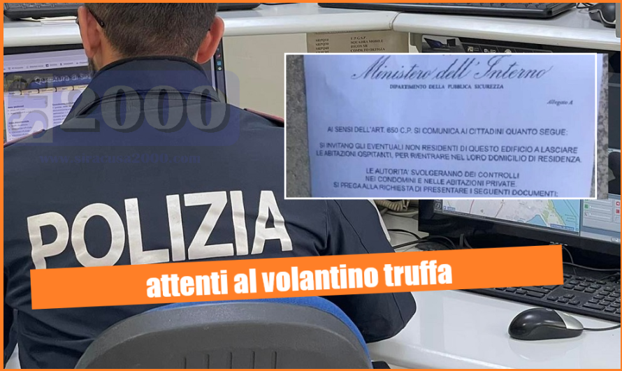 Da qualche giorno stanno arrivando alla Polizia di Stato segnalazioni, da ogni parte d’Italia, in merito ad un volantino che viene affisso nei portoni e nelle facciate delle abitazioni recante la dicitura “Ministero dell’Interno – Dipartimento della Pubblica Sicurezza”, con il qualesi invitano i cittadini che si trovano fuori casa, a fare rientro nei luoghi di residenza.
