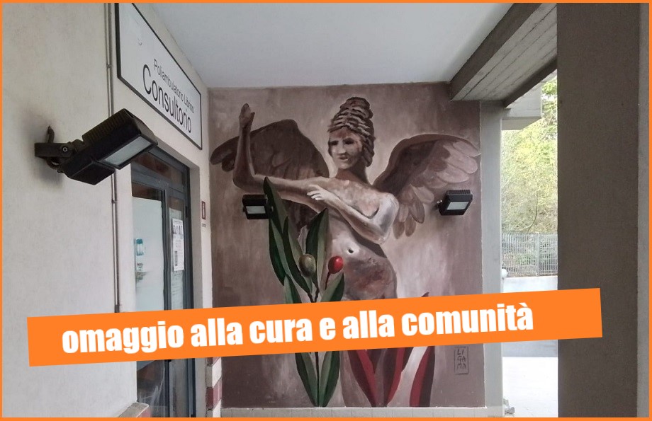 L’ingresso del Consultorio familiare di Librino è stato arricchito da un murales, realizzato da Ligama, artista siciliano noto in tutto il mondo, che raffigura una grande dea alata che si prende cura della comunità, simboleggiata da ulivi con foglie e frutti verdi e rossi.