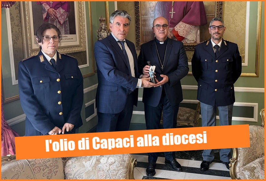 In occasione della Settimana Santa, il Questore Salvatore Fazzino ha consegnato al vescovo Giuseppe La Placa, un’ampolla con l’olio ottenuto dal raccolto degli ulivi del “Giardino della Memoria” di Capaci.