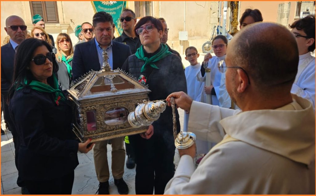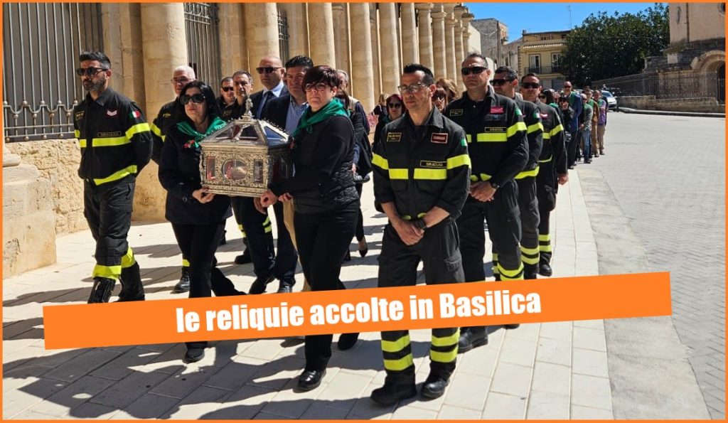 Portate da due fedeli, foulard verdi, e scortate dai Vigili del fuoco, le reliquie di Santa Lucia sono arrivate, questa mattina, nella Basilica di Santa Lucia al sepolcro, in Borgata, accolte dal rettore, fra’ Daniele Cugnata.